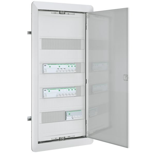 Kleinverteiler für Hohlwandmontage bestehend aus: Mauerkasten mit Stahlblech Gerätetragschiene, 4-reihig, 48 TE , Blendrahmen mit Volltür aus Stahlblech, mit PE/N-Steckklemmen, mit FI-N-Erweiterungsklemme, vorverdrahtet und bestückt mit: 2x FI 40 A (3P+N), 9x LS Schalter 1-polig 16 A, 1x LS Schalter 3-polig 20 A, 1x Überspannungsableiter Typ 2, 1x Hauptleitungsabzweigklemme