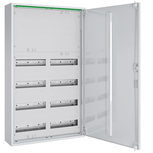 Komplettschrank für Aufputzmontage bestehend aus: RM-Gehäuse mit Volltür, 2x Verteilerfeld 4-reihig, 96 TE, für Reiheneinbaugeräte, mit geschlossenener Abdeckung und isolierten Gerätetragschienen für Reihenklemmen, IP44