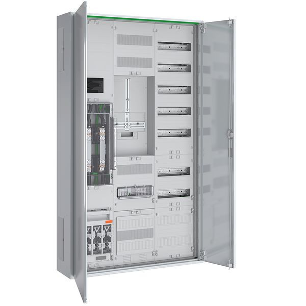 Wandlermessschrank 200 A Dauerstrom nach TAB Syna bestehend aus: Zählerschrank Schutzisoliert IP44, 2x NAR mit 40 mm Sammelschiene 2x12x5 mm bestückt mit NH1 Trenner, 4x Sammelschienenklemme 120 mm², 1x Sammelschienenklemme 70 mm²,1x Wandlermodul BxH 250x450 mm mit Klarsichtabdeckung, 3x Wandlerlasche Bauform A mit 30x5x170 mm,1x AAR BxH 250x450 mm mit Lasttrennschalter 3-polig 250 A und Klemme für N und PE, 1x Wandlerzusatzraum BxH 250x300 mm 24 TE bestückt mit Spannungspfadsicherungen 1x Sicherungshalter TeSys 3p 32A für Sicherungsgröße 10x38 mm, Steuersicherung 1x LS 1p B6 25kA und Wandler-Trennklemmen nach TAB Syna, 1x 3-Punkt Zählerplatz 450 mm, Verteilerfeld 5-reihig mit 60 TE und PE-/N-Steckklemmen, 1x APZ-Raum 300 mm mit RJ45 Schnittstelle