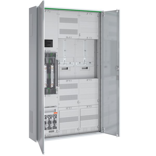Wandlermessschrank 200 A Dauerstrom nach TAB Netze-BW bestehend aus: Zählerschrank schutzisoliert in IP44, 3x NAR mit 40 mm Sammelschienensystem 2x12x5 mm bestückt mit NH1-Trenner, 4x Sammelschienenklemme 120 mm², 1x Sammelschienenklemme 70 mm², 1x Wandlermodul BxH 250x450 mm mit Klarsichtabdeckung, 3x Wandlerlasche Bauform A mit 30x5x170 mm, 1x AAR BxH 250x450 mm mit Lasttrennschalter 3-polig 250 A und Klemme für N und PE, 1x Wandlerzusatzraum BxH 250x300 mm 24 TE bestückt mit Spannungspfadsicherungen 3x LS 1p B10 25kA und Wandler-Trennklemmen nach TAB Netze-BW, 1x 3-Punkt Zählerplatz 450 mm, 1x 3-Punkt FRE-Platz 450 mm, 1x APZ-Raum 300 mm mit RJ45 Schnittstelle