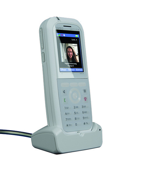 robustes DECT-Handgerät für die AGFEO DECT IP-Basis, antibakteriell nach ISO-Norm 22196 (2nd Edition), abwischbare Folientastatur, wasserresistent IP65, Gummimantel, 2“ TFT Farbdisplay, beleuchtet, 249 Telefonbucheinträge (PRIVAT), zentrales Telefonbuch (Zugriff auf bis zu 3000 Einträge der DECT IP-BASIS), Bluetooth für AGFEO Headsets, Headsetanschluss (3,5mm Klinke), Notruftaste, Mikrofon-Stummschaltung, Freisprechen und Lauthören, Rauschunterdrückung (Noise Reduction), Türgongsimulation, Türöffnerfunktion, Anrufliste für ein-/abgehende und verpasste Anrufe, Anrufschutz, automatische Rufannahme, Uhrzeit-/Datumsanzeige, menüangepasste Navigationstasten, CLIP-Funktion - Sehen wer anruft, Anklopfen Ein/Aus, Rückfragefunktion, 20 Klingeltöne, Vibrationsalarm, Tastensperre, Weckfunktion, Konferenzschaltung, Gesprächsübergabefunktion, zwischen mehreren Verbindungen wechseln (MAKELN), Ruf Abweisen, Gesprächszeit max. 17 Stunden, Standbyzeit max. 200 Stunden, Mobilteil T:22 mm,B:48 mm,H:122 mm, weiß