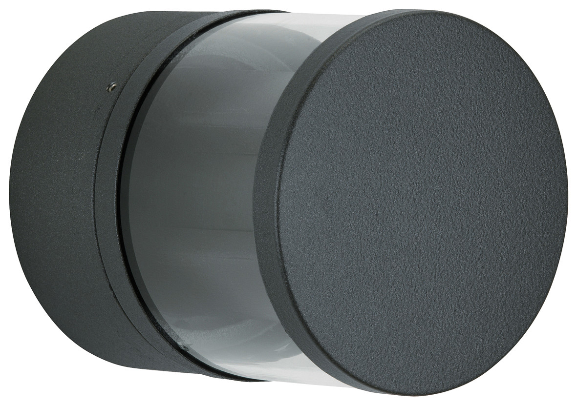 aus Aluminium und klarem Acrylglas bis 60 grad beidseitig einstellbarer Lichtverteilung bestückt mit 2 x LED 3 Watt - 330 lm - 3000 integriertem Konverter und Montageplatte Farbe: anthrazit Abmessung: d 100 mm x 110 mit Leuchtmittel der Energieeffizienzklasse: E