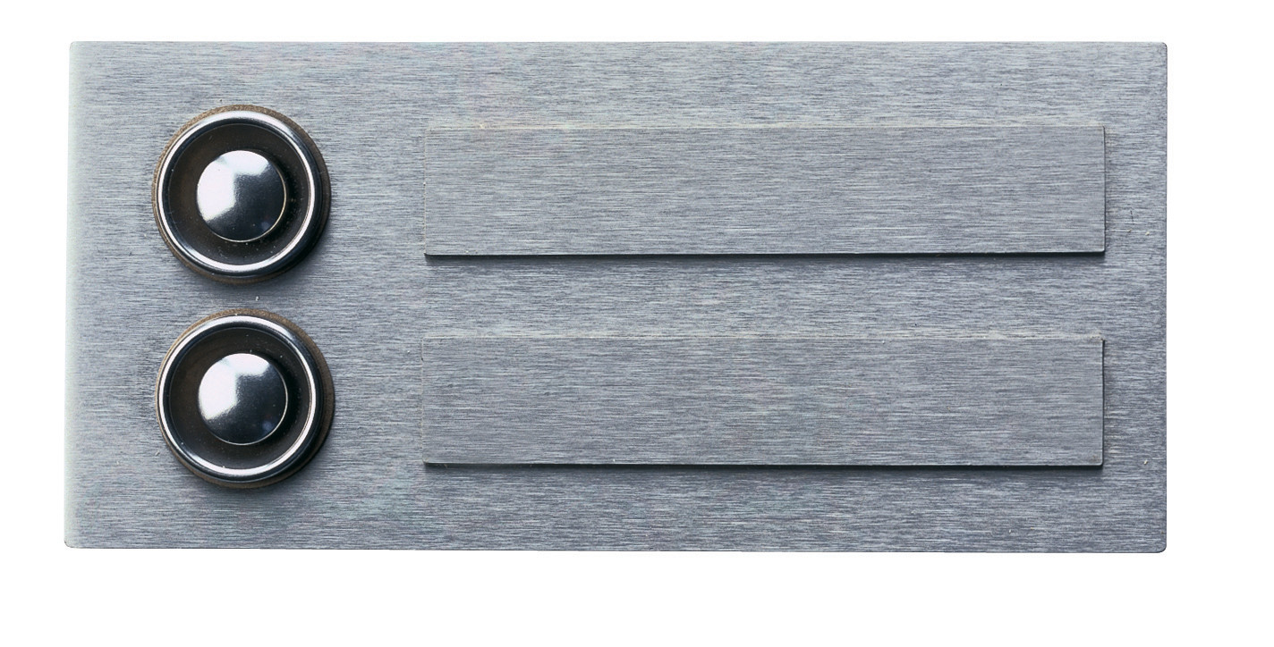 Albert-Klingelplatte 690941 - 2-fach aus Edelstahl, mit zwei Edelstahl-Klingelknöpfe sowie Bolzenbefestigung. Mit zusätzlichen Namensschildern zum gravieren und aufkleben. Ausmaße: 60 x 130 x 6 mm