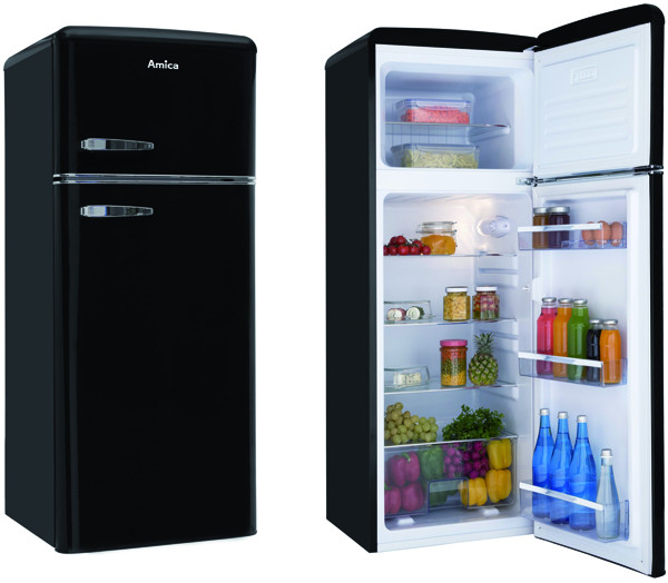 mechanische Steuerung, Kühlteil: 3 höhenverstellbare Ablagen aus Sicherheitsglas, 1 Obst- und Gemüseschublade mit Glasabdeckung, Gefrierteil: manuelle Abtauung, 1 Ablagerost, Türanschlag rechts, Retro-Design