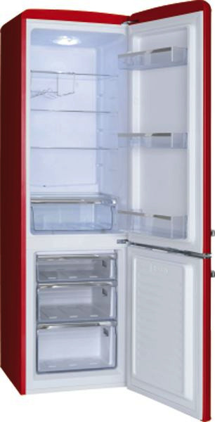mechanische Steuerung, Kühlteil: LED-Beleuchtung, 3 höhenverstellbare Ablagen aus Sicherheitsglas, 1 Obst- und Gemüseschublade mit Glasabdeckung, Gefrierteil: manuelle Abtauung, 3 transparente Schubladen, Türanschlag rechts, Retro-Design