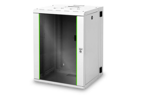 Die Netzwerkschränke zur Wandmontage der Unique Serie wurden für eine besonders komfortable und flexible Netzwerkverkabelung entwickelt. Dank des integrierten Scharniers im rückseitigen Rahmen, kann das Gehäuse bei Bedarf zur Seite geklappt werden um beispielsweise Montagearbeiten im hinteren Schrankbereich einfach vornehmen zu können. Im Dach eines jeden Schrankes befindet sich ein aufschiebbarer Kabeleinlass mit Moosgummidichtung. Die Rückwand und das Bodenblech sind ausgestattet mit ausgestanzten Kabeleinlässen mit Kunststoffabdeckung. Zusätzlich ist der rückseitige Rahmen ausgestattet mit Bürstenleisten an der Ober- und Unterseite. Für die Aufnahme eines Lüftermoduls wird das Dachchassis ebenfalls mit einem ausgestanzten Bereich versehen. Ein Paar galvanisierte, mit in beide Richtungen ablesbare Höheneinheiten beschriftete 483 mm (19")-Profilschienen sind im Inneren verbaut. Diese lassen sich in der Tiefe verstellen. Der rückseitige Rahmen verfügt zusätzlich über eine 483 mm (19“)-Lochung. Jeder Schrank ist eine robuste Stahlkonstruktion aus bis zu 1,5 mm starkem Stahlblech. Die Farbgebung erfolgt in Form von elektrostatischer Pulverbeschichtung in den Standardfarben Grau (RAL 7035) und Schwarz (RAL 9005). Modular abschließ- und abnehmbare Seitenwände sowie die abschließ- und abnehmbare Fronttür, verbessern die Zugänglichkeit. Ein Türanschlagswechsel kann vorgenommen werden. Die Wandmontage erfolgt in zwei einfachen Arbeitsschritten: Der Rahmen des Gehäuses wird in beliebiger Öffnungsrichtung an die Wand geschraubt und im Anschluss mit dem Gehäuse verbunden. Mit optional erhätlichen Nivellierfüßen oder Rollen, können die Wandgehäuse der Unique Serie ebenfalls freistehend verwendet werden.