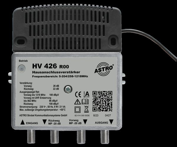 Breitbandverstärker mit 204 MHz Rückweg, Vorweg bis 1218 MHz, Verstärkung Vorweg 26 dB, Ausgangspegel Vorweg 96 dBuV, Verstärkung Rückweg 22 dB, Ausgangspegel Rückweg 108 dBuV, diverse Einstellmöglichkeiten mittels Pads und Steckbrücken zur Konfiguration des Vor- und Rückweges