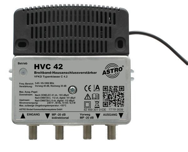 | Kurzbeschreibung | 1 GHz Breitbandverstärker 39 dB / 102 dBuV Vorweg, VFKD zertifiziert Typklasse C (4.2) |