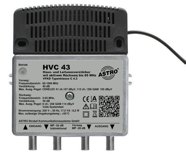Breitbandverstärker mit 65 MHz Rückweg, Vorweg bis 1006 MHz, Verstärkung Vorweg 40 dB, Ausgangspegel Vorweg 107 dBuV, Interstage-Slope 0/7/10 dB im Vorweg steckbar, Interstage-Dämpfung 0-10 dB im Vorweg, Verstärkung Rückweg 30 dB, Ausgangspegel Rückweg 112 dBuV (6 Ch. 256 QAM / 8 MHz), Dämpfungssteller Vorweg 0-15 dB, Entzerrer Vorweg 0 - 15 dB, Dämpfungssteller Rückweg 0 - 15 dB (jeweils im Ein- und Ausgang), Entzerrer Rückweg 0 - 10 dB, Messpunkte im Ein- und Ausgang, 4 x F-Anschlussbuchsen, VFKD zertifiziert Typklasse C (4.3)