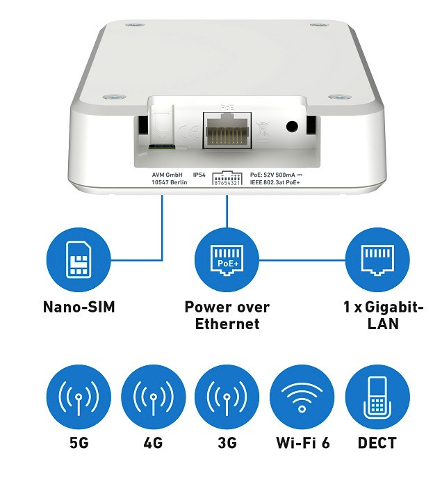 High-Speed-Internet über 5G für den Innen- und Außeneinsatz Die neue FRITZ!Box 6860 5G bringt das ultraschnelle 5G-Mobilfunk-Internet mit bis zu 1,3 GBit/s ins kabellose Heimnetz. Als Fixed-Wireless-Access-Lösung unterstützt sie sowohl 5G (NSA, SA) als auch LTE. Mit leistungsstarkem WLAN Mesh mit Wi-Fi 6 verteilt sie die Daten mit bis zu 3 GBit/s drahtlos im ganzen Haus. Dank des kompakten Designs und der Strom- und Datenversorgung über Power over Ethernet kann die vielseitige FRITZ!Box 6860 5G sowohl im Innen- als auch im Außenbereich genutzt werden. Eine DECT-Basisstation für Telefonie und Smart-Home-Anwendungen rundet das vielseitige Leistungsspektrum ab. Die FRITZ!Box 6860 5G bietet mit Wi-Fi 6 Geschwindigkeiten bis zu 2.400 (5 GHz) und 600 MBit/s (2,4 GHz). Als WLAN-Mesh-Zentrale sorgt sie für beste Netzabdeckung, indem alle FRITZ!-Geräte ein gemeinsames Netz (Mesh) bilden und die WLAN-Leistung optimieren. Bei Außeninstallation kann sie über den LAN-Anschluss am mitgelieferten PoE-Netzteil mit einem FRITZ!Repeater oder einer weiteren FRITZ!Box (z. B. FRITZ!Box 4050) kombiniert werden, um die WLAN- und DECT-Versorgung im Innenbereich zu verbessern. Lieferumfang: FRITZ!Box 6860 5G, PoE-Netzteil (PoE+, 26W) inkl. Gigabit-LAN-Uplink, 2 x 2,5 m Netzwerkkabel (UV-beständig), Gehäuseadapter für Innenbereich, Gehäuseadapter für Außenbereich inkl. Befestigungsschraube, 5 selbstklebende Kabelklemmen, 2 x Klebepad für Gehäuseadapter, Installationsanleitung, FRITZ! Notiz