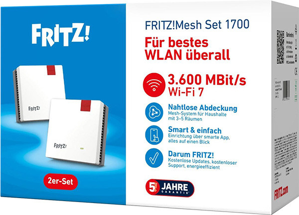 Kompakter FRITZ!Repeater mit Wi-Fi 7, wenn dein WLAN mehr Reichweite braucht: Der FRITZ!Repeater 1700 erweitert dein WLAN mit Wi-Fi 7 und ist perfekt auf die FRITZ!Box abgestimmt. Wi-Fi 7 sorgt für schnelles und zuverlässiges WLAN, das intelligente FRITZ! Mesh für die beste Verbindung. Der FRITZ!Repeater 1700 unterstützt Wi-Fi 7 im 2,4-GHz- sowie im 5-GHz-Band und ermöglicht Geschwindigkeiten von bis zu 3,6 GBit/s. Vergrößert das Heimnetz mit WLAN Mesh, 1x Gigabit-LAN für die kabelgebundene Vernetzung. Einfache Installation und komfortable Bedienung, 2er-Set