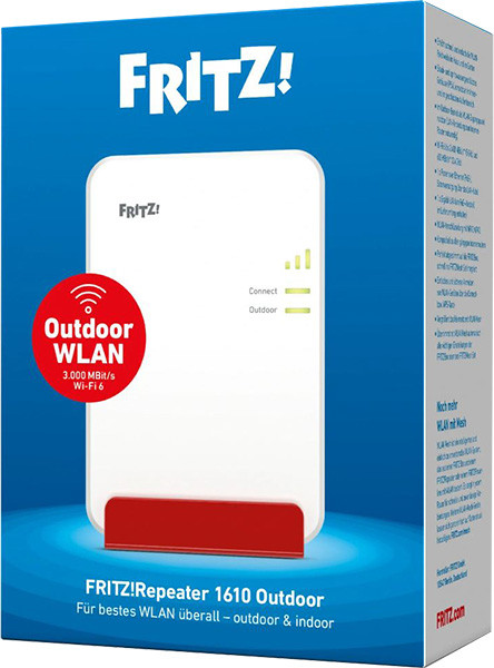 Der FRITZ!Repeater 1610 Outdoor erweitert dein WLAN im Haus und im Garten. Das intelligente FRITZ! Mesh sorgt für eine komfortable Einrichtung und jederzeit besten WLAN-Das spritzwasser- und staubgeschützte Gehäuse ist IP54-zertifiziert und erlaubt die Aufstellung bzw. Montage des FRITZ!Repeater 1610 Outdoor etwa in Fensternähe oder im geschützten Außenbereich.So genießt du auch draußen schnelles Internet, ruckelfreies Streaming und besten Empfang, ganz automatisch und mit maximaler Reichweite, Leistungsstarkes WLAN mit Wi-Fi 6 bis zu 3.000 MBit/s im 2,4-GHz- sowie im 5-GHz-Band