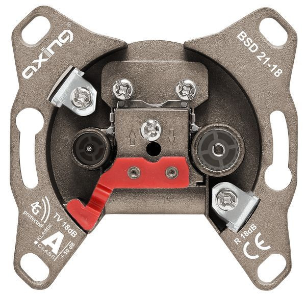 Hyperbreitband-Durchgangsdose 18 dB, 5 - 2200 MHz, CATV Klasse A (+10 dB) gemäß EN 50083-2 Breitbandig rückkanaltauglich Montagefreundlich Absetzmaß 8/13 mm Oberflächenveredelt