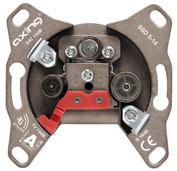 SAT-Durchgangsdose 14 dB, 5 - 2200 MHz, CATV | SAT Klasse A (+10 dB) gemäß EN 50083-2 Rückkanaltauglich 5 - 65 MHz Einkabeltauglich für Unicable I (EN50494) und Unicable II (EN50607) Diodenentkoppelt Montagefreundlich Absetzmaß 8/13 mm Verlängerte F-Buchse Oberflächenveredelt