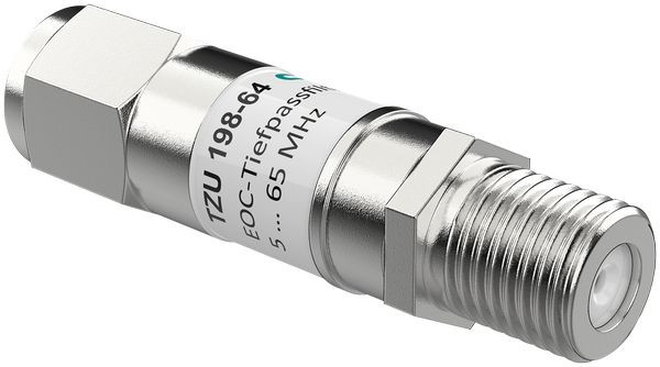 EoC-Tiefpassfilter 5 - 65 MHz, F Verhindert Störungen bei Radio/TV-Signalen bis 204 MHz Zum Einschränken des EoC-Frequenzbereich auf 5  -  65 MHz Sperrtiefe > 50 dB @ 85 - 2200 MHz F-Buchse, F-Stecker