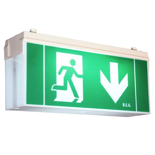 Rettungszeichen-/Fluchtwegleuchte mit Einzelbatterie, Robustes Kunststoffgehäuse IP54, Erkennungsweite 25 m, Umweltfreundlicher NiMH-Akku, Taster am Gehäuse für den Funktionstest, Inkl. Leuchtmittel, Akku und vier Piktogrammen
