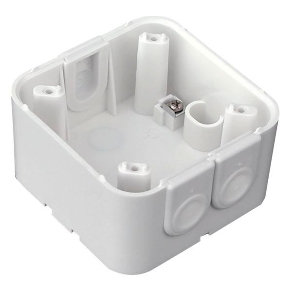 Mit dieser Zubehör-Dose kann der Wandschalter Indoor 180 Aufputz montiert werden., Der Schutzgrad kann durch zusätzliche Verwendung des Zubehör-Rahmens (Art.-Nr.: 92139) auf IP54 angehoben werden. Dadurch kann die Aufputz-Version auch im Freien oder in Feuchträumen verwendet werden.