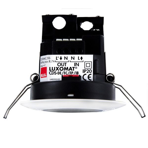 Dämmerungsschalter CdS-DE (Deckeneinbauversion) zum automatischen Schalten von Beleuchtungen. Fernbedienbar mit separat zu bestellender IR-CdS-FP. Einstellung von Lichtwert sowie Ein- und Ausschaltverzögerung über Potentiometer von außen. Sichtbare Höhe nach Deckeneinbau nur 6mm.