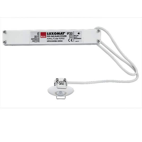 Mini-Slave-Gerät zur Erweiterung des Erfassungsbereiches eines Master-Gerätes, Leistungsteil passt durch die Bohrung für den Melder in der Decke (bei 34 mm d. ), Schaltimpuls zum Master-Gerät bei erkannter Bewegung unabhängig von der Umgebungshelligkeit, Mit 230 V-Master-Geräten kompatibel, für Ausnahmen siehe bitte das jeweilige Master-Gerät., Federklemmen für den einfachen und schnellen Einbau in abgehängte Decken und in Leuchten, Inklusive d. 45 mm Abdeckring und Abdecklamellen