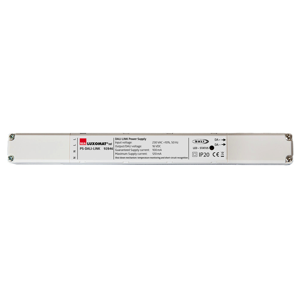 DALI-Netzteil für die B.E.G. DALI-LINK Multiraum-Lösung zum Einbau in abgehängte Decken., Parametrierung der DALI-LINK-Lösung erfolgt über Bluetooth mit einem Smartphone und der B.E.G. DALI-LINK App., An die Spannungsversorgung können z. B. 25 DALI-Leuchten und 6 DALI-LINK Steuergeräte (Multisensoren oder Tasterschnittstellen) angeschlossen werden., Es ist möglich, maximal ein weiteres DALI-LINK Netzteil parallel zu betreiben, womit sich die Anzahl der DALI-Teilnehmer im DALI-LINK System verdoppelt (50 DALI-Leuchten / 12 DALI-LINK Steuergeräte)., Integrierte Temperaturüberwachung und Kurzschlusserkennung, Integrierte LED zur Visualisierung von Betriebsinformationen, DALI-2 zertifiziertes Produkt, Bei diesem Artikel handelt es sich um eine Komponente eines Lichtsteuerungssystems von B.E.G., welches den Einsatz von DALI-Betriebsgeräten (Leuchten, Relais) anderer Hersteller unterstützt, Das Produkt kann gemäß der gegebenen DALI-2 Produkteigenschaften herstellerübergreifend eingesetzt werden, Es sind zusätzliche Systemkomponenten (Hardware) von B.E.G. erhältlich, Es ist zusätzliche, kostenlose Software von B.E.G. erhältlich