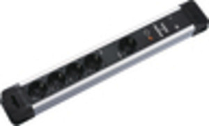 Steckdose schwarz, Kunststoffprofil silber, schwarze Endkappen, mit 2-poligem Wippschalter beleuchtet.