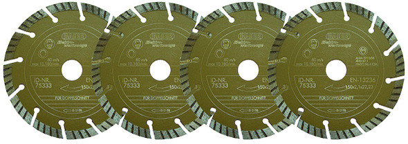 Zubehörset 4-teilig Diamanttrennscheiben Gold, Segmenthöhe 10 mm, geeignet für Beton/Beton armiert und harten Kalksandstein, Maße (Ø x H): 150 x 22,23 mm