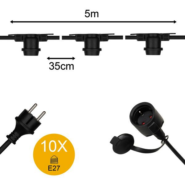 BAI Lichterkette 5m Schwarz mit 10 Fassungen E27 Max 25W pro Fassung IP44 CLII Kabel H07RN-F 2x1.5mm² mit Stecker Koppelbar. Fassungen und Lampen sollten nach unten zeigen
