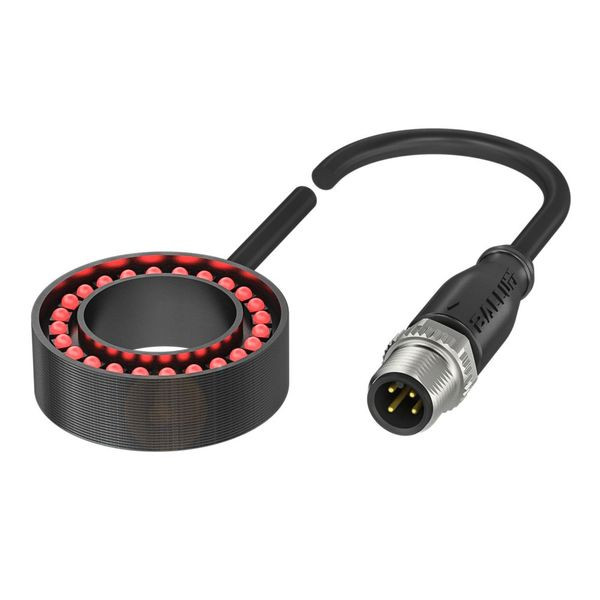 Anschluss = Kabel mit Steckverbinder, M12x1-Stecker, 4-polig, 0.3 m, Ausführung = Ring-Beleuchtung, Abmessung = Ø 40.5 x 13 mm, Bemessungsbetriebsspannung Ue DC = 24 V, Stromaufnahme max. = 146 mA, 208 mA (Boost-Modus), Betriebsart = Normal, Boost, Digitale Eingänge = Trigger, Material = Aluminium eloxiert, schwarz, Leuchtfläche = Ø 38 mm/Ø 26 mm, Lichtart = LED Rotlicht, Wellenlänge = 616 nm, Abstrahlwinkel = 40 °, Umgebungstemperatur = -10...50 °C, Zulassung/Konformität = CE, UKCA, WEEE, Schutzart = IP20