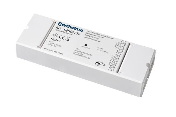 Farbsteuergerät für 1- bis 5-Kanal Anwendungen in einem Gerät, ermöglicht ein einfaches Nachrüsten bereits bestehender Installationen, per Funk ansteuer- und vernetzbar ohne zusätzliche Verdrahtung, Eingangsspannung: 12 bis 36 V DC, einfache Bedienung mittels Funk-Fernbedienungen (1- bis 5-Kanal), vier unabhängige Zonen speicherbar, drei (1- bis 4-Kanal) bzw. vier (5-Kanal) Speicherplätze, welche individuell mit Festfarben oder Farbverläufen belegt werden können, optional über ein 5-Kanal Touchpanel (Einbau in Schalterdose) ansteuerbar