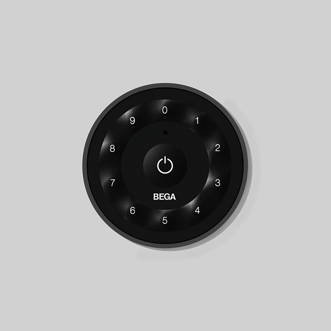 BEGA Remote Control ONE 10526 mit Wandhalterung. Die Fernsteuerung bietet eine komfortable Bedienung des smarten LED-Lichtsystems BEGA Smart. Sie verfügt über zehn frei programmierbare Tasten, denen eine einzelne Leuchte, Leuchtengruppe, Szene oder Lichtfarbe zugeordnet werden kann. In Verbindung mit dem Smart DALI-Controller (BEGA Ergänzungsteil) können auch DALI-Leuchten und Zigbee-Leuchtmittel gesteuert werden. Die Konfiguration erfolgt per Smartphone oder Tablet über die App BEGA Smart.