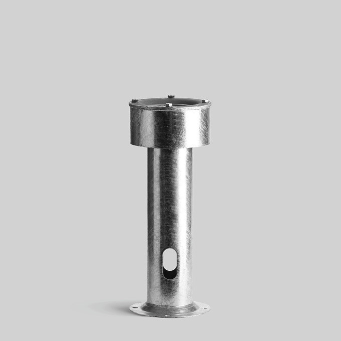 BEGA Erdstück 70897, aus feuerverzinktem Stahl, nach EN ISO 1461. Länge 600 mm. Eine Schweißkonstruktion bestehend aus Grundplatte, Rohrstück und Flanschplatte mit Gewindeeinsätzen mit Befestigungsschrauben M10 x 35 aus Edelstahl, Werkstoff-Nr. 1.4301, seitliche Leitungseinführung 90 x 40 mm. Für die Befestigung von Leuchten und Lichtmasten mit Fußplatte im Boden.