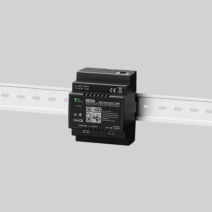 BEGA DALI Connector 71209 für die Inbetriebnahme und Steuerung von DALI-Betriebsgeräten und BEGA Steuerungskomponenten einer DALI-Linie via BEGA Connect. Modul für die Befestigung auf 35 mm-Hutschiene ? DIN EN 60715. Breite Reiheneinbaugerät (REG): 4 TE. Funkstandards: Bluetooth, WLAN. Integrierte Antenne. Anschlüsse: Ethernet und DALI. Der BEGA DALI Connector ist geeignet für die Steuerung und Visualisierung eines DALI-Systems bestehend aus maximal 64 DALI-Geräten. Versorgungsspannung: 100-240 V 50/60 Hz. DALI Out: Imax = 250 mA. DALI Spannung: U(DALI) = 16 VDC. Umgebungstemperatur: -20 °C bis 65 °C. Leerlaufleistung: 0,5 W / TBD.