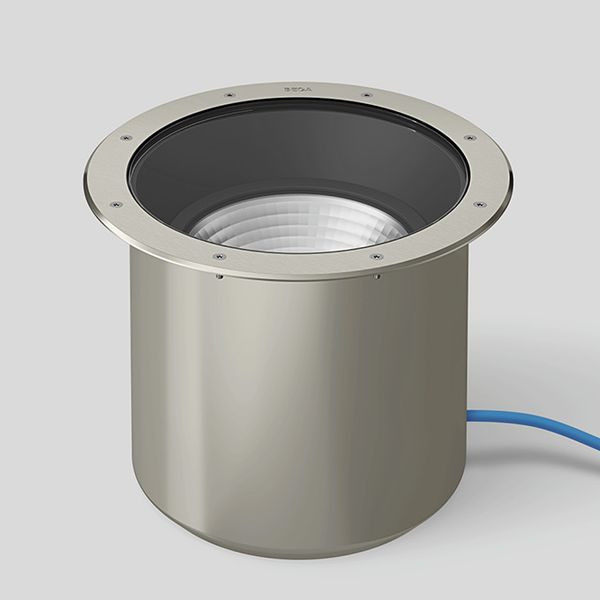 BEGA Bodeneinbauleuchte 84893K3, überrollbar für Druckbelastung bis 2.000 kg (~20 kN). BEGA Hybrid Optics® : Hocheffiziente und verlustarme Lichtverteilung durch Reflektor und optischer Linse. Rotationssymmetrisch breitstreuende Lichtstärkeverteilung. Optisches System 0-30° schwenkbar und um 360° stufenlos drehbar. LED, 76 W Leuchten-Anschlussleistung, Leuchten-Lichtstrom 7209 lm, Halbstreuwinkel 56°, Farbtemperatur 3000 K. Farbwiedergabeindex (CRI) > 80. Mit austauschbarem BEGA LED-Modul mit einer mittleren Bemessungslebensdauer von 85.000 Betriebsstunden (L80B50 bei ta = 25 °C). 20-jährige Nachliefergarantie auf das LED-Modul und die Verschleißteile. Mit BEGA Ultimate Driver® LED-Netzteil, DALI-steuerbar, 220-240 V, 0/50-60 Hz. Schutzart IP 68 10 m. Leuchte aus Edelstahl, Werkstoff-Nr. 1.4301. Sicherheitsglas klar. Reflektor aus eloxiertem Reinstaluminium. Optische Silikonlinse. 1,8 m wasserbeständige Anschlussleitung 07RN8-F 5 G 1 qmm mit eingebautem Wasserstopper und 1,2 m PVC-Installationsrohr. Leuchtendurchmesser 410 mm, Einbautiefe 310 mm.