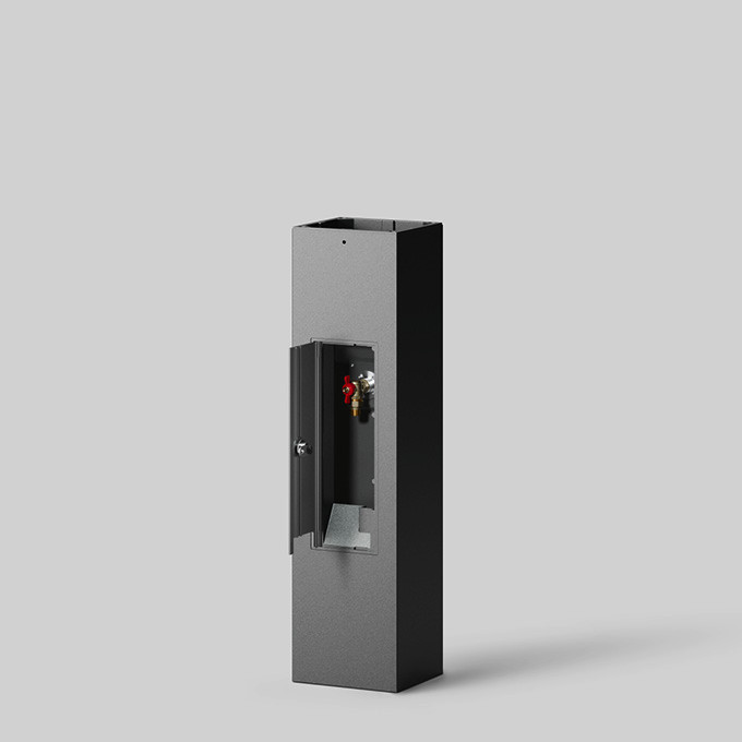 BEGA Pollerleuchtenrohr 85078 mit integriertem Wasseranschluss. Aluminium Beschichtungstechnologie BEGA Unidure® , Farbe Grafit. Für die Verwendung im modularen Systempollerleuchten-Programm. Innenliegender Winkel-Kugelhahn aus Messing. 1m Panzerschlauch mit Überwurfmutter 3/4". Mit abschließbarer Tür und BKS Sicherheitsschloss mit zwei Schlüsseln. Mit Montageplatte zum Aufschrauben auf ein Fundament oder auf das Erdstück 70896. Abmessungen: 220 x 220 mm. Höhe über Flur 875 mm.