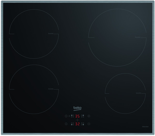 4 Induktions-Kochzonen, Booster für alle Kochzonen, Restwärmeanzeigen für alle Kochzonen, Steuerung mit Sensortasten, digitale Anzeige der Kochstufen, 9 Kochstufen, Timer, Sicherheitsabschaltung, Kindersicherung, umlaufender Rahmen