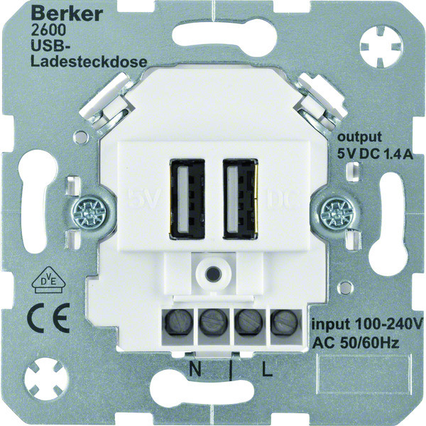 100 - 240 V~, 50/60 Hz, 5 V= (+/- 5%), Ausgangsstrom pro Buchse max. 1 A, Ausgangsstrom bei Betrieb beider Buchsen max. 1,4 A, Leistungsaufnahme (Standby) max. 75 mW, Leiterquerschnitt max. 2,5 mm2, Einbautiefe 32 mm, mit 2 USB-Buchsen Typ A, zum Laden mobiler Endgeräte über USB-Kabel, kurzschlussfest und überlastsicher (elektronische Sicherung), mit Schraubklemmen (doppelt zum Durchverdrahten), keine Datenübertragung möglich!
