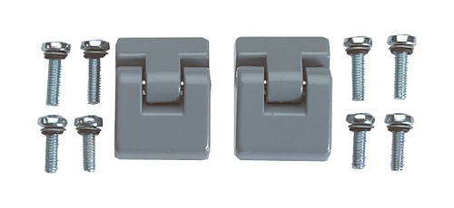 Außengelenke zur scharnierten Befestigung des Gehäusedeckels. Schwenkbereich des Deckels ca. 155°. Aluminiumguss (lackiert in RAL 7001 - kundenspezifische Farbe gemäß Spezifikation des Gehäuses möglich). Zur Befestigung ist eine mechanische Bearbeitung an den Gehäusen erforderlich.
