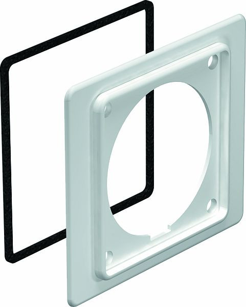 Zwischenflansch zur Montage von CEE Steckdosen 16A. Der Zwischenflansch wird bei der Montage von der Gerätedose CEE hinter das Kanaloberteil für Geräteeinbaudosen montiert. Passend für 400 V CEE 16A 5-pol. 6h, Art.-Nr. 6109874.