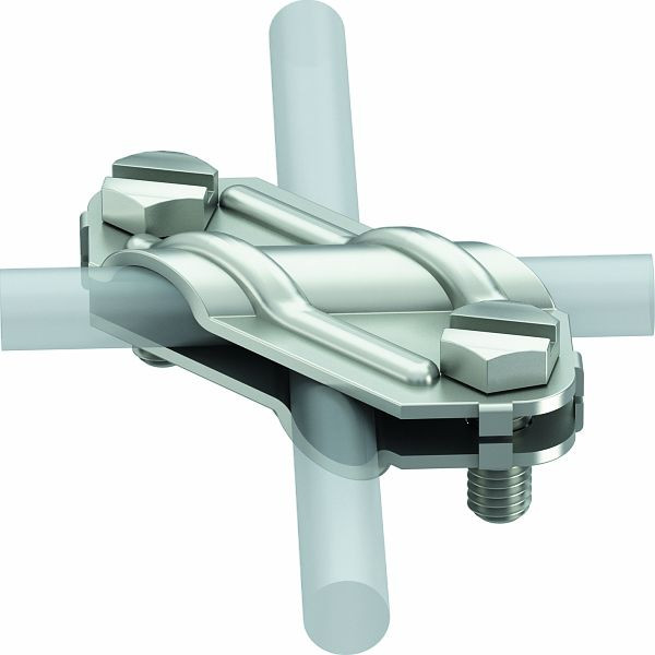 250/Cu: mit Sechskantschrauben M 6 x 16 (VA) • entspricht den Anforderungen nach VDE 0185-305-3 (IEC/ EN 62305-3) • Passung: Rd 8-10 x Rd 8-10 • Passung: Rd 8-10 x FL 30 • Passung: FL 30 x FL 30 • montiert mit 2 Sechskantschrauben M8 x 20