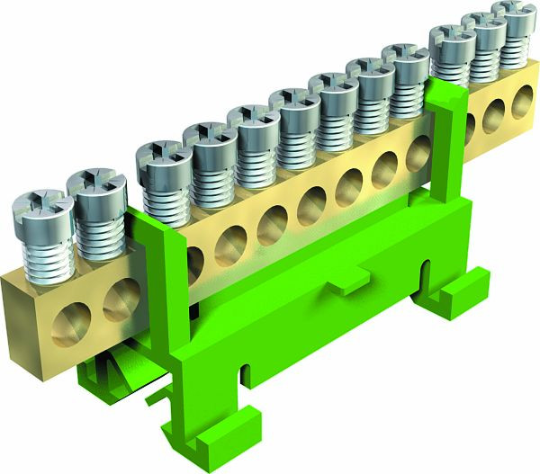 12 Klemmstellen bis 16 mm², Klemmschiene Messing vernickelt, Schrauben Stahl, galvanisch verzinkt und transparent passiviert, zum Aufschnappen auf Hutschienen 35 mm nach DIN EN 50022 (quer) oder Flachschienen 10 x 2-2,5 mm (längs)