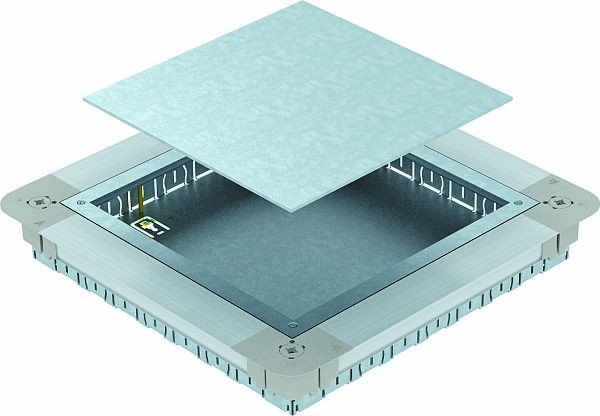 Unterflur-Gerätedose mit Montagedeckel und Deckelblindplatte mit Seitenwänden aus Stahlblech. Für den Einbau eines quadratischen Geräteeinsatzes GES9 55 in Estrichhöhen ab 55 mm. Lässt sich stufenlos auf Estrichnennhöhe nivellieren und der Estrich kann bündig an die Estrichabzugskante angearbeitet werden. Mit Rohreinführungsöffnungen je Seite 7 x M20, 3 x M25, 4 x M32. Nutzbare Rohrgröße bei einer Systemhöhe von 55 mm: M20.