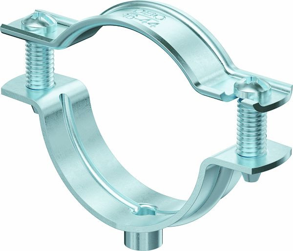 Abstandschelle zur Montage von Rohren und Kabeln an Wand, Decke und Boden. Mit selbstsicherndem Oberteil. Befestigung über Ansatz mit Innengewinde.