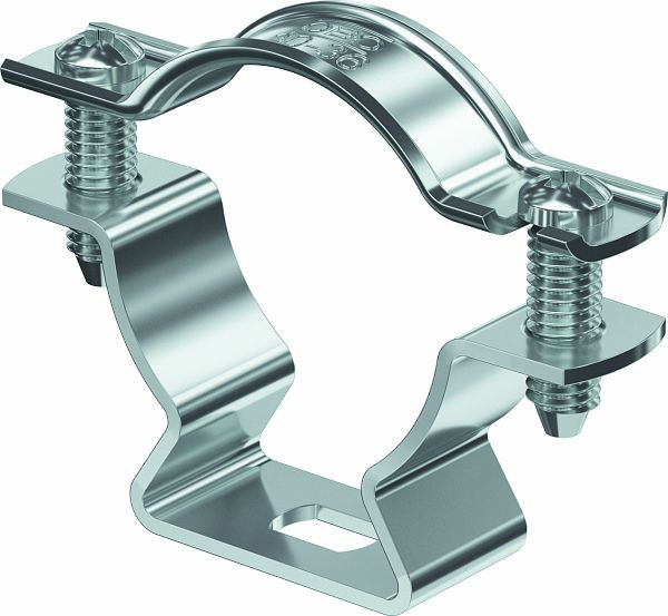 Abstandschelle zur Montage von Rohren und Kabeln an Wand, Decke und Boden. Mit selbstsicherndem Oberteil. Befestigung über Langloch.