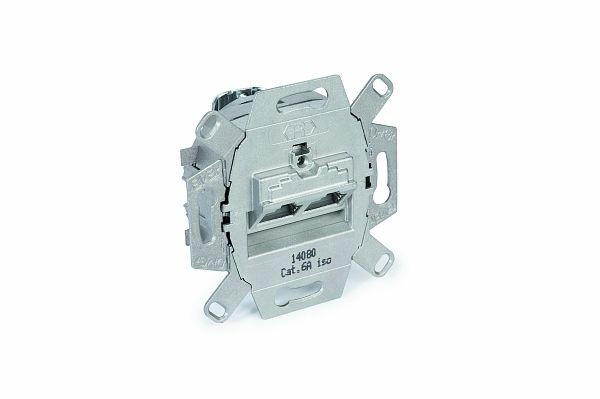 UAE Cat. 6 A ISO 8/8 Anschlussdose mit abbrechbarem Tragring für Stegversion. 2 Anschlüsse. Erfüllt die höchsten übertragungstechnischen Produktanforderungen gemäß ISO/IEC 11 801:2011-06 für 500 MHz Bandbreite (10 Gbit/s). Zentralplatte nicht im Lieferumfang enthalten, muss separat bestellt werden.
