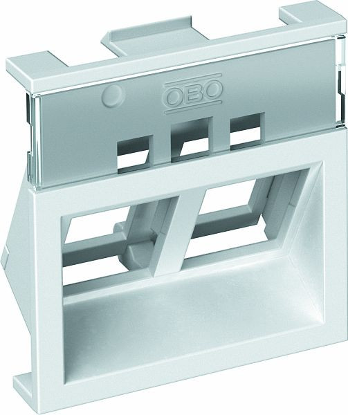 Trägerplatte (inkl. Beschriftungsfeld und Schrägauslass) für Keystone-Module. Breite der Öffnung: 14,9 mm; Höhe der Öffnung: 19,4 mm.