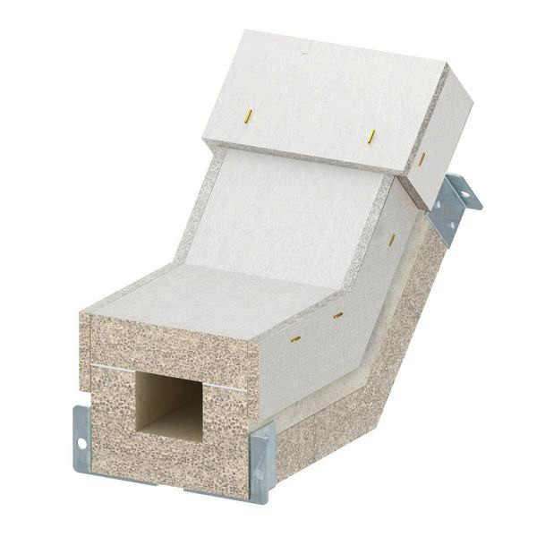 Vertikalbogen steigend für Brandschutzkanal PYROLINE® Con S, Typ BSKH09-K0506 bestehend aus wasser- und frostbeständigen Glasfaserleichtbeton zur Herstellung von vertikalen Richtungsänderungen (45°) im Kanalverlauf. Fertig montierte Verbindungsbeschläge sorgen für eine schnelle Montage vor Ort, lose aufgelegte Deckel für eine schnelle Revision und Nachbelegung.
