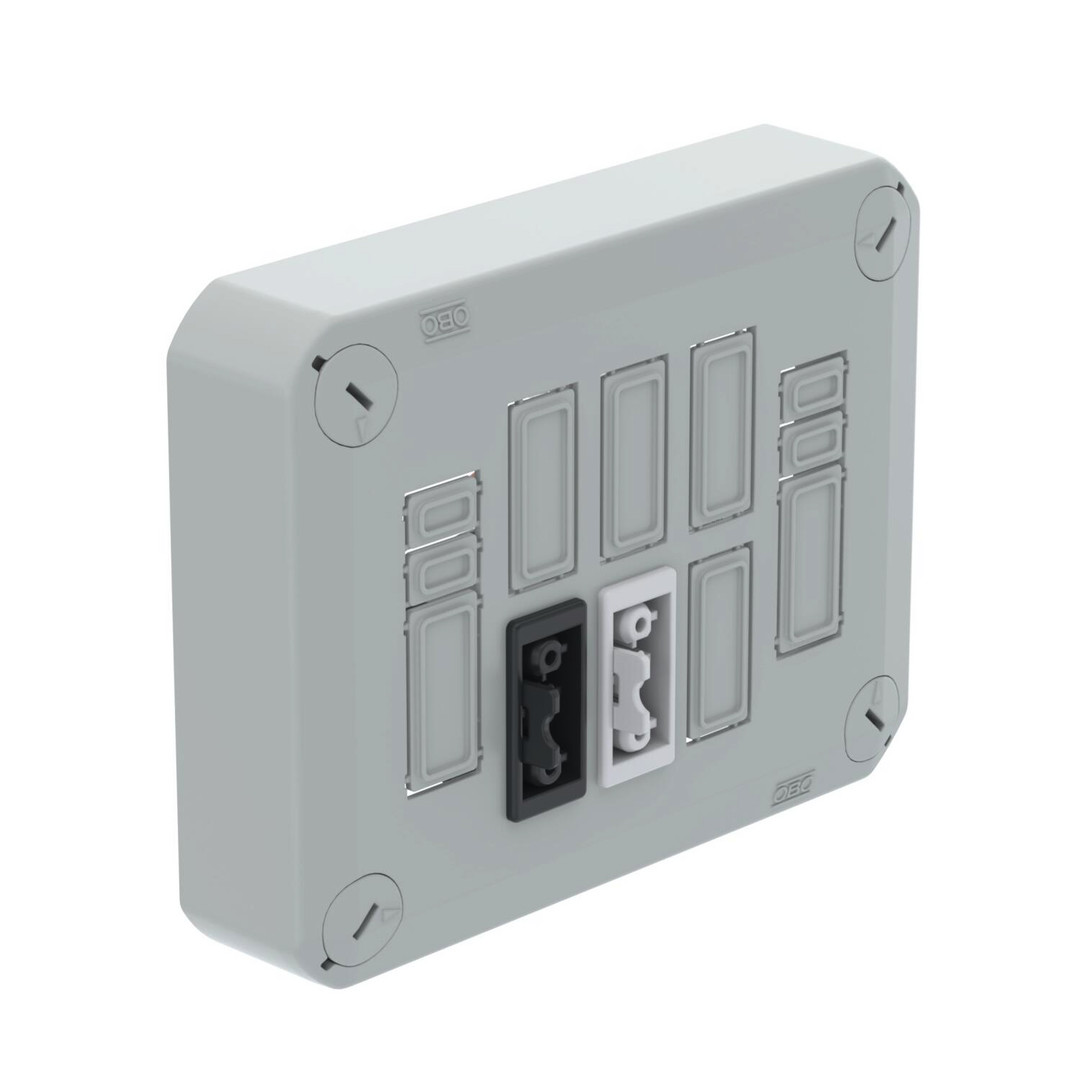 Steckbarer Deckel zum Verschließen von Kabelabzweigkästen, bestückt mit 2 Wieland GST18-Stecksystemen, vorverdrahtet mit Hebelsteckklemmen. Mit Schnellverschluss im Deckel, plombierbar. Halogenfreies Material, UV-resistent. Flammwidrig nach DIN EN 60695-2-11, Prüftemperatur 650°C. Schlagfestigkeit IK07 bei Raumtemperatur. Schutzart IP30.