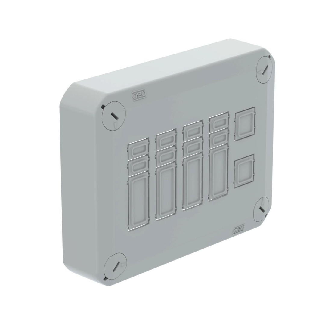 Steckbarer Deckel zum Verschließen von Kabelabzweigkästen, ausgestattet mit 6 Ausbrechöffnungen für Anschlussbuchsen von Wieland und Wago, 3- bis 5-polig. Mit Schnellverschluss im Deckel, plombierbar. Halogenfreies Material, UV-resistent. Flammwidrig nach DIN EN 60695-2-11, Prüftemperatur 650°C. Schlagfestigkeit IK07 bei Raumtemperatur. Schutzart IP30.
