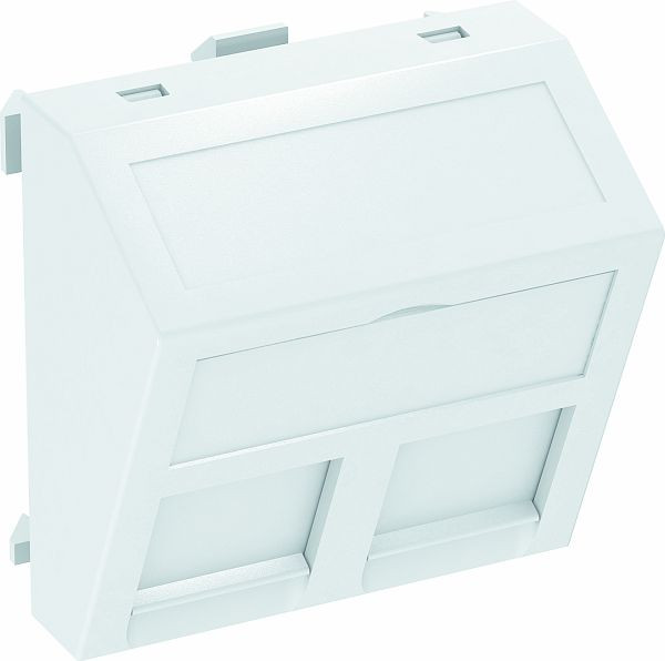 Datentechnikträger mit schrägem Auslass und Verschlussschieber zur Aufnahme von zwei Datentechnik-Anschlussmodulen mit RJ45-Buchse. Die Rastbefestigung eignet sich für den waagerechten und senkrechten Einbau in die Systemumgebung. Typ RM hat eine spezielle Modulaufnahme und ist für eine indirekte Befestigung der Daten-Anschlussmodule in der Montageöffnung ausgelegt.