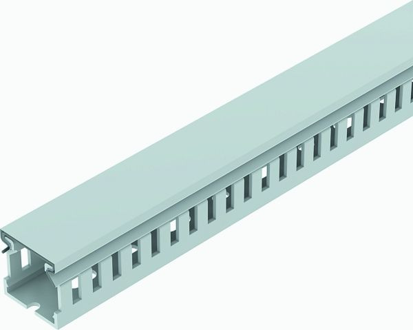 Halogenfreier Verdrahtungskanal inkl. Oberteil und Bodenlochung zur waagerechten und senkrechten Verlegung elektrischer Kabel und Leitungen im Schaltschrank. Mit doppelseitigen Klebeband am Kanalboden als Montagehilfe. Ausführung als metrischer Kanal. Das Ausbrechen der Stege erfolgt werkzeuglos. Sonderlängen auf Anfrage.